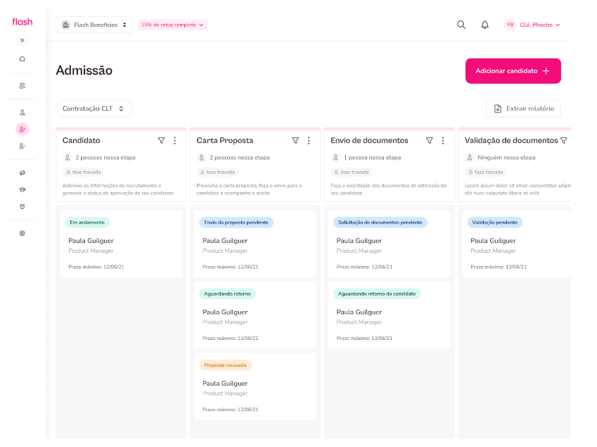 Lembre-se de que cada fluxo (CLT, PJ e Estágio) possui fases diferentes no kanban. Sendo assim, ao clicar em “Adicionar candidato” no fluxo de PJ, por exemplo, você estará adicionando um candidato PJ. Não será possível adicionar um candidato de contratação diferente ao fluxo selecionado;