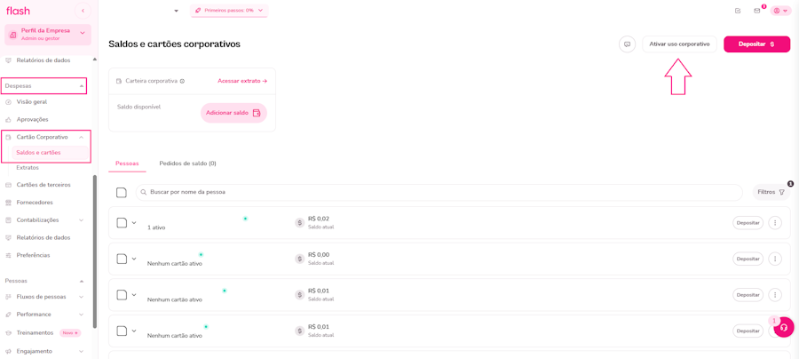 Para ativar o uso do Cartão Corporativo Flash, siga os passos abaixo na plataforma: