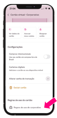 Se sua empresa definiu regras de uso para o cartão corporativo, você pode consultá-las diretamente no aplicativo Flash. Acesse Cartões e consulte por cartão específico, conforme imagem ao lado.