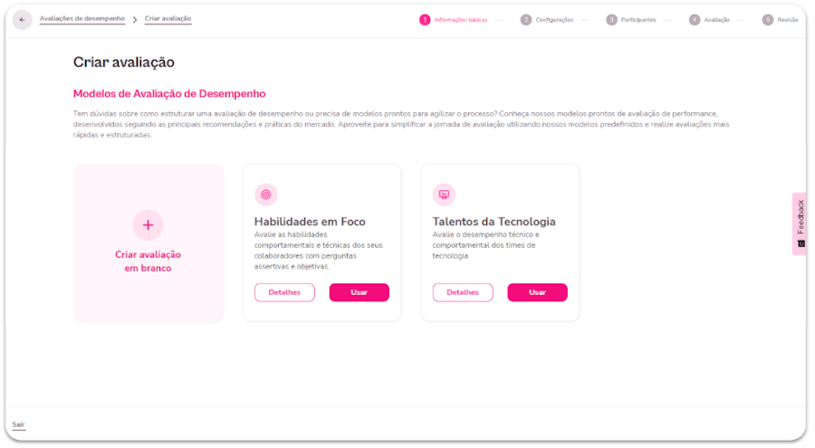 Inicie criando uma nova “Avaliação em branco” ou escolha um dos nossos “Modelos padrões” seguindo as principais recomendações e práticas do mercado.