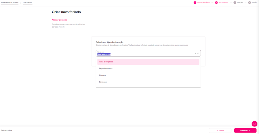 No campo de alocações pode selecionar: toda a empresa, departamentos, grupos e pessoas.