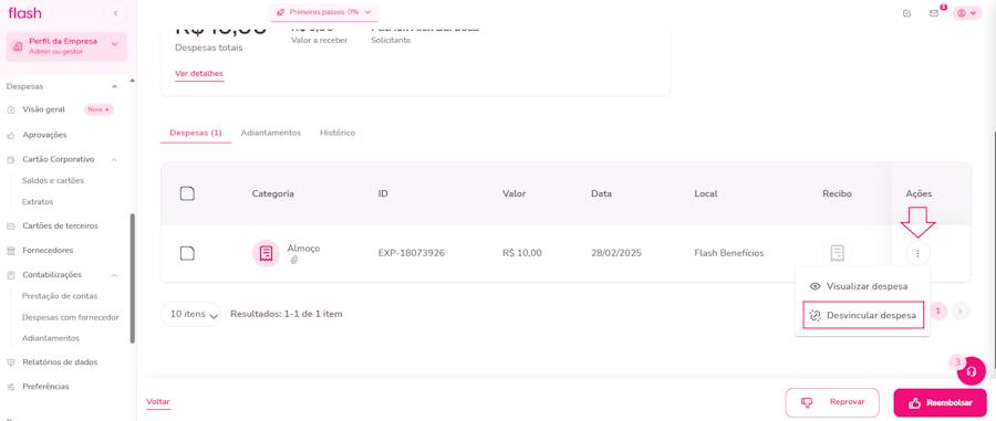 5. Após entrar no relatório, você pode desvincular alguma despesa clicando em Desvincular Despesa;