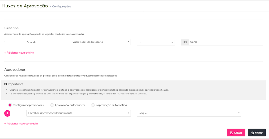 Por exemplo: quando "Valor Total do Relatório" for maior ou igual a R$ 10, todos os relatórios que englobam o valor serão enviados para o fluxo escolhido. Neste caso, irão para a aprovação da Raquel: