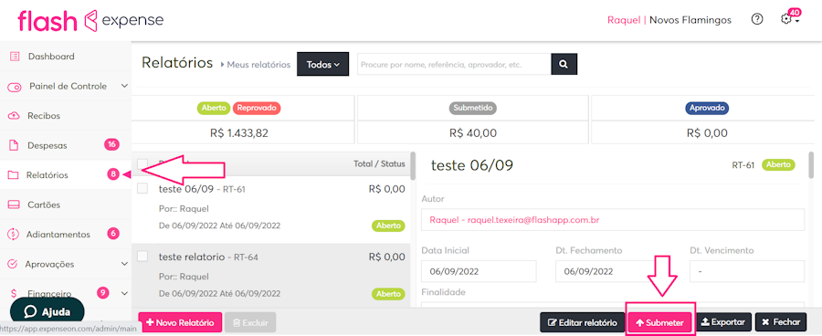 2. Após adicionar as despesas/adiantamentos que desejar, clique no botão "Submeter" e o relatório será encaminhado para aprovação