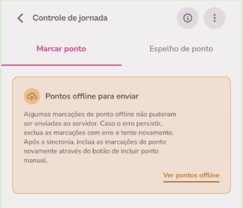As marcações offline realizadas ficam registradas apenas no dispositivo utilizado, e não são sincronizadas com o sistema de Controle de Jornada até o momento que o dispositivo for conectado novamente à internet. Ao conectar com a internet, aparecerá uma mensagem avisando que as marcações não foram sincronizadas ainda, com a opção para selecionar quais pontos quer sincronizar: