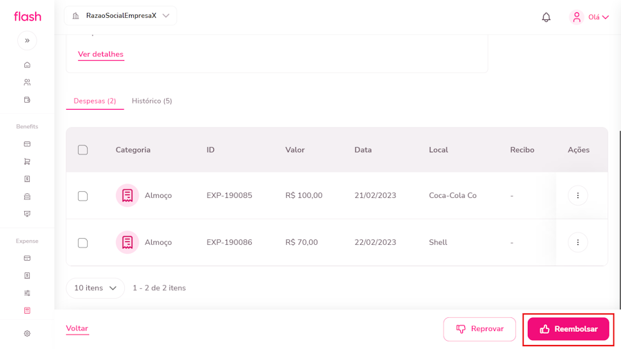Caso esteja tudo ok com o relatório enviado para sua deliberação, você deve realizar o pagamento do reembolso de acordo com os processos internos da empresa para, em seguida, “dar baixa” no sistema, clicando em “Reembolsar”.