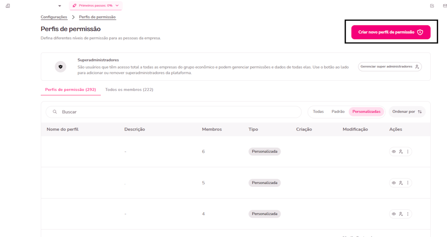 Para criar um novo perfil de acesso às pessoas de sua empresa, basta seguir no menu Configurações > Plataforma >Perfis de Permissão “Criar novo perfil de permissão”.