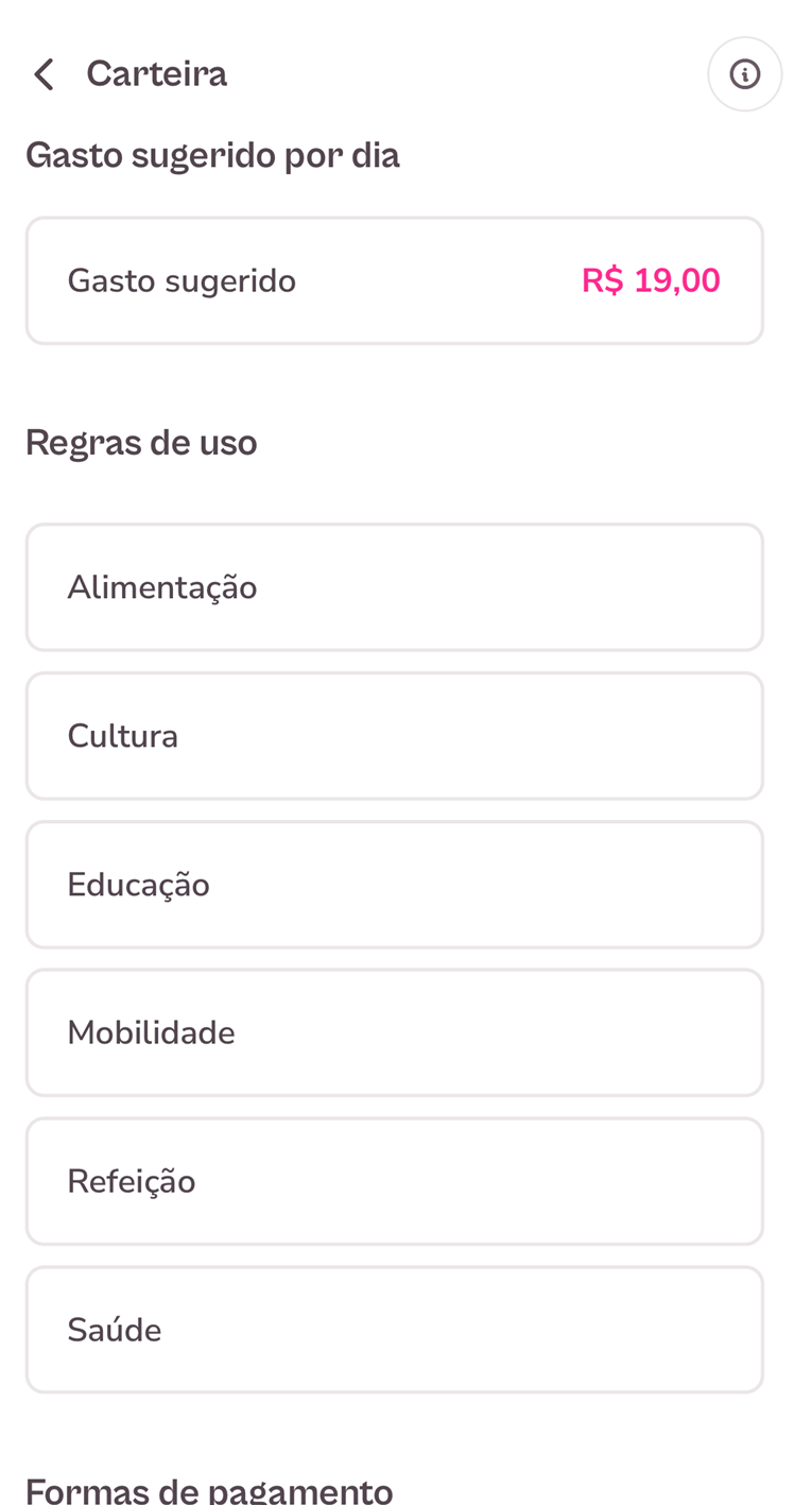 Os saldos das categorias não se somam — Cada compra precisa ter valor suficiente na categoria correspondente (Refeição, Alimentação, Mobilidade etc.).