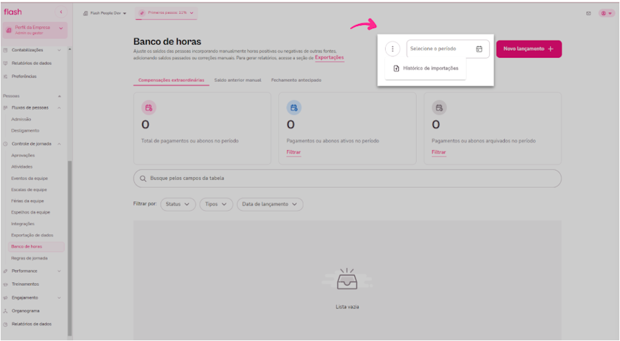 O painel de Banco de horas é o menu que centraliza os ajustes de saldo de banco de horas dos colaboradores, a partir do lançamento de horas positivas ou negativas, importação de saldos passados e fechamentos antecipados.