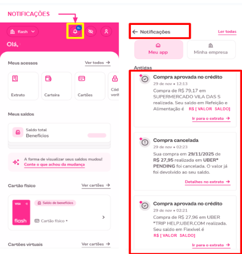 1º PASSO: Identificar o motivo da recusa de acordo com a notificação que está disponível no seu Aplicativo Flash > Tela Inicial > Ícone de Sino > Notificações: