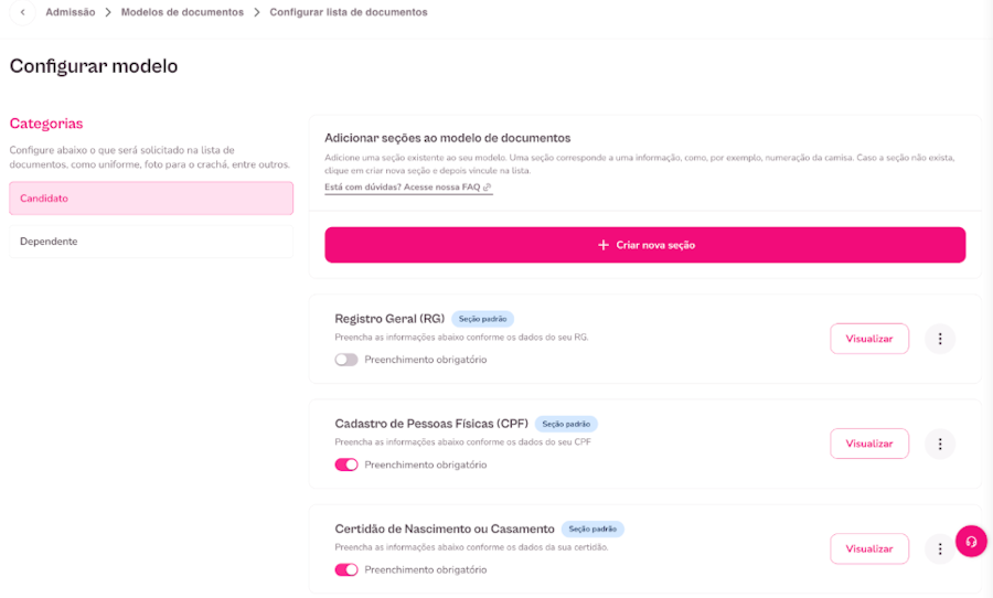 Mas não se preocupe, você poderá editar uma lista de documentos pré-definida ou criar um novo modelo de lista de documentos e incluir campos de documentos personalizados para serem solicitados aos seus candidatos.