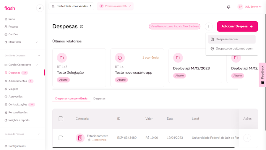 Agora, basta criar relatórios, solicitar reembolsos ou prestar contas de despesas de cartão corporativo em nome da pessoa selecionada.