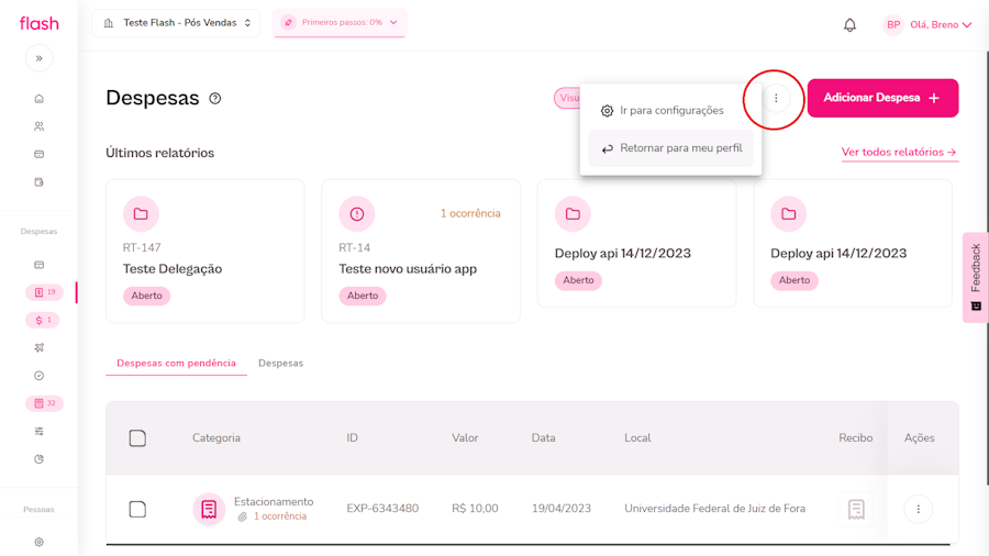 Após os lançamentos, clique novamente nos três pontinhos, disponíveis dentro da seção “Despesas”, e selecione “Retornar para meu perfil”, a fim de você voltar a realizar lançamentos em seu nome.