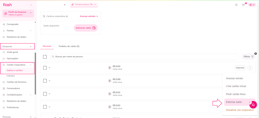 Se um colaborador não utilizar o saldo disponível no cartão, você pode devolver esse valor para a carteira corporativa da empresa. Siga o passo a passo: